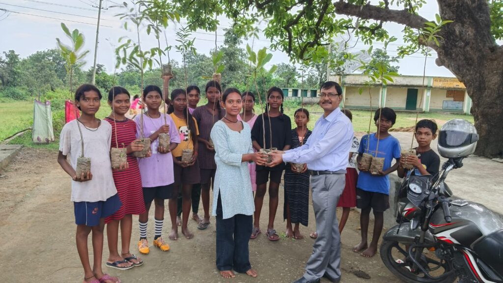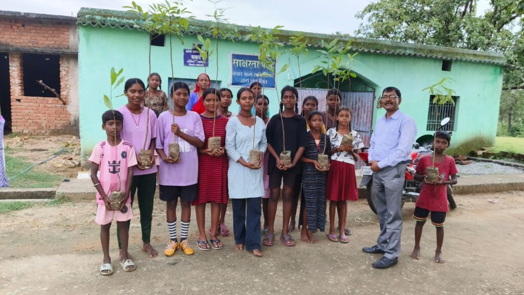Children and adolescents participate in a tree plantation drive organised with support from Panch Sutra Foundation, holding saplings that will be planted in and around their village to promote environmental conservation and green livelihoods.