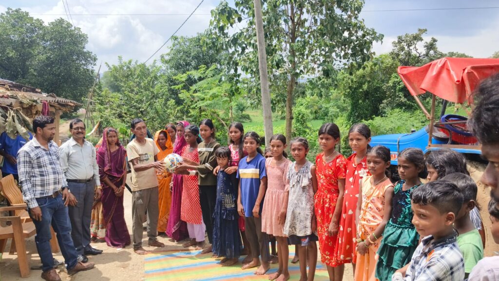 Rural girls receiving a football from Panch Sutra Foundation during a community sports empowerment program