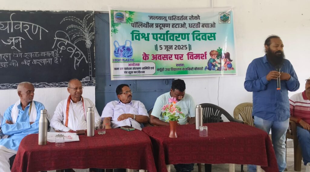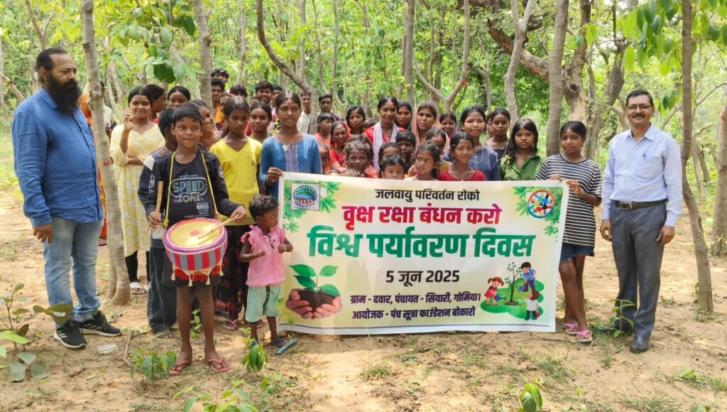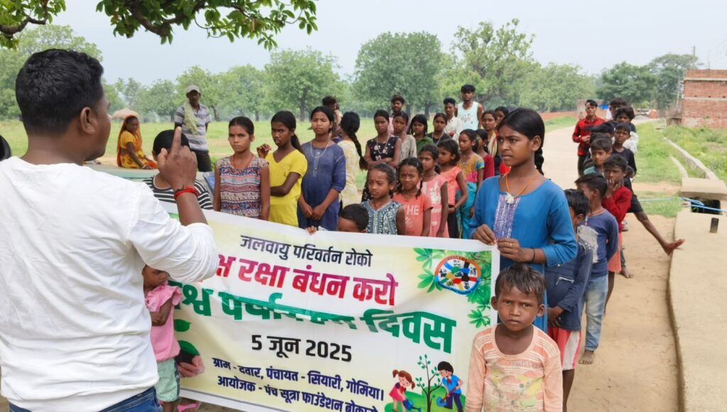 Panch Sutra Foundation organising a World Environment Day awareness programme in rural communities, combining school‑based discussions, climate change education and forest activities where children and villagers pledge to protect trees and reduce plastic pollution. Through this environment awareness campaign, the NGO promotes tree conservation, sustainable living and active participation of tribal and village youth in protecting local ecosystems and combating global warming.
